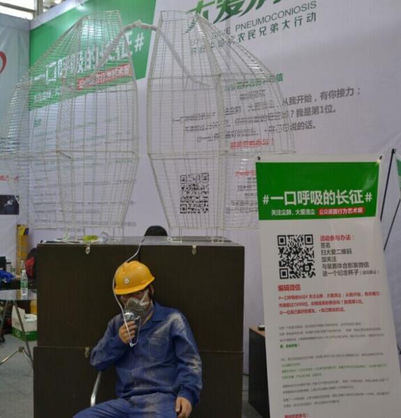 尹小龙告诉记者,他是在两三年前知道“尘肺病”的,之后一直在微博上与大爱清尘基金的发起人王克勤互动。尹小龙说,除了在本次慈展会展台前做《呼·吸》的表演外,尹小龙还在展馆内办了一场主题沙龙,邀请了一些农民工患者讲述他们的故事。