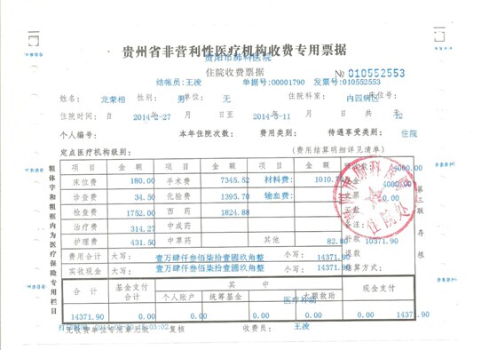总计治疗花费人民币壹万肆仟叁佰柒拾壹元玖角(14371.90元)。其中项目支付壹万元整(10000.00元),医院减免贰仟贰佰玖拾元柒角(2290.70元),患者自付贰仟零捌拾壹元贰角(2081.20元)。