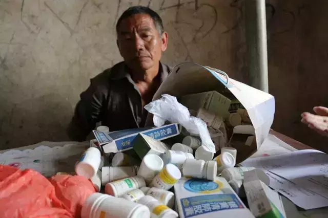 我拿起瓶子看看,里面还有甘草片,这么严重的病靠着吃平时止咳嗽的药治疗,他真是舍不得给自己花钱。他从墙上取下来一个袋子,里面是满满一大兜子药和药瓶,倒出来铺满了一桌子,我说吃过的药瓶怎么不扔,他一边一个一个装回去一边说,这药瓶我都攒着了,还可以卖钱呢。看着他拖着略有残疾的腿一跛一跛的走在我前面,我在想,这么多年,他是怎么坚持着挖煤、打钻,出去打工,下地务农的?