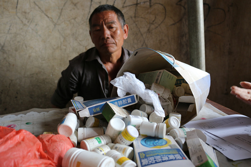 2007年,病情严重,吴正员再也不能出去打工了,其他像他一样的尘肺病患者都在家休息吃药治病。可即使是这样,他还是没有闲着,在家里务农换取一点收入让女儿去读书。他每天要吃三次药,一次18粒,一天要吃54粒药。
