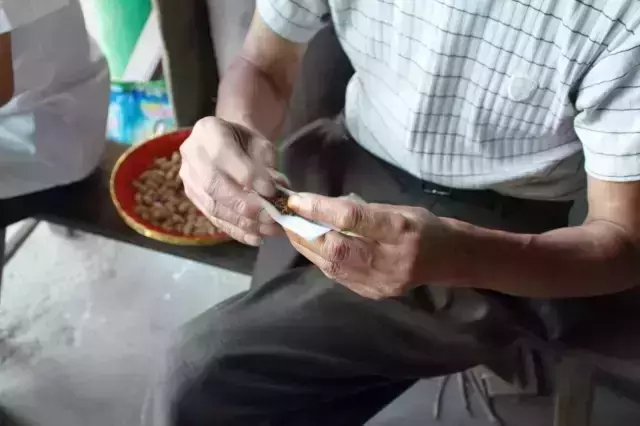 放下花生,他拿出一个皱巴巴的塑料袋,里面装着烟丝,我们拿起袋子看,原本应该是个盐袋子。他很熟练地卷起一颗土烟抽了起来,他自己说:医生说他心脏和肺都不好,不能抽烟,但是他戒不掉,因为在家闲着没事干。