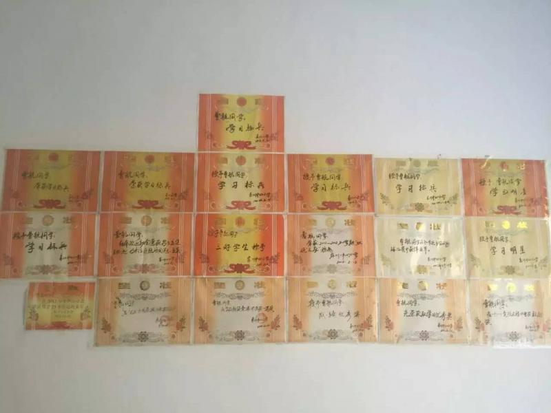 儿子曹航在泗峡口上学,品学兼优,房屋中堂的墙上贴着他近几年在校获得的十九个奖状。因没钱坐车,他每周上学要步行往返几十公里的山路。