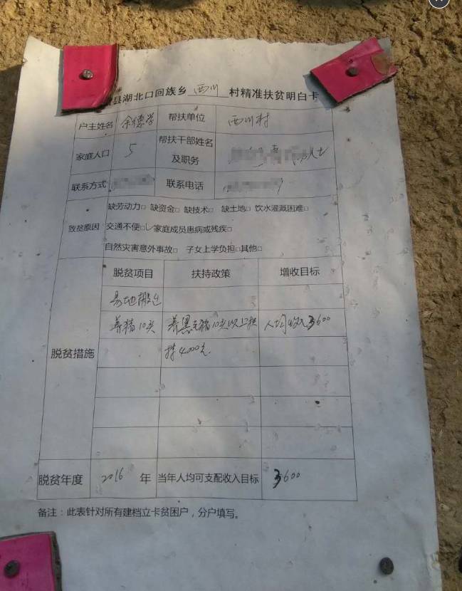 董老师走在屋檐下,土坯房上贴着湖北口回族乡西川村精准扶贫明白卡,卡上清晰的记录着户主姓名,家庭人口,扶贫措施等。“养猪10头?猪呢?”董老师带有疑惑地询问,“抓了几只小猪,死完了,死的就剩这一头了,没有技术养不活啊……”候启云说。