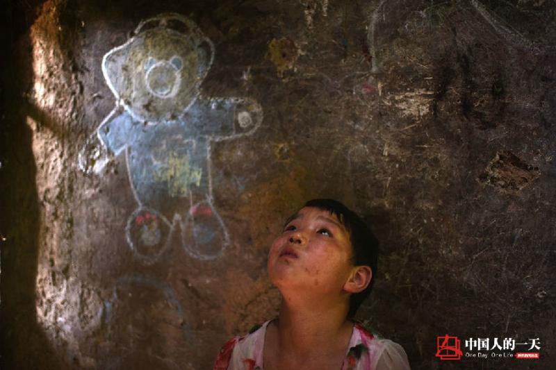 秦岭深山有户人家,门板后面的土墙上有一幅粉笔画:一只穿白大褂的大熊猫,熊猫胸前挂着十字架。这是玲玲八年前画的。那年她才8岁,爸爸得了严重的尘肺病,几次被送往医院抢救。她希望这只幻想中的“熊猫医生”能治好爸爸的病。图为玲玲的小妹妹依靠在有些褪色的“熊猫医生”旁。(摄影/胡国庆 )