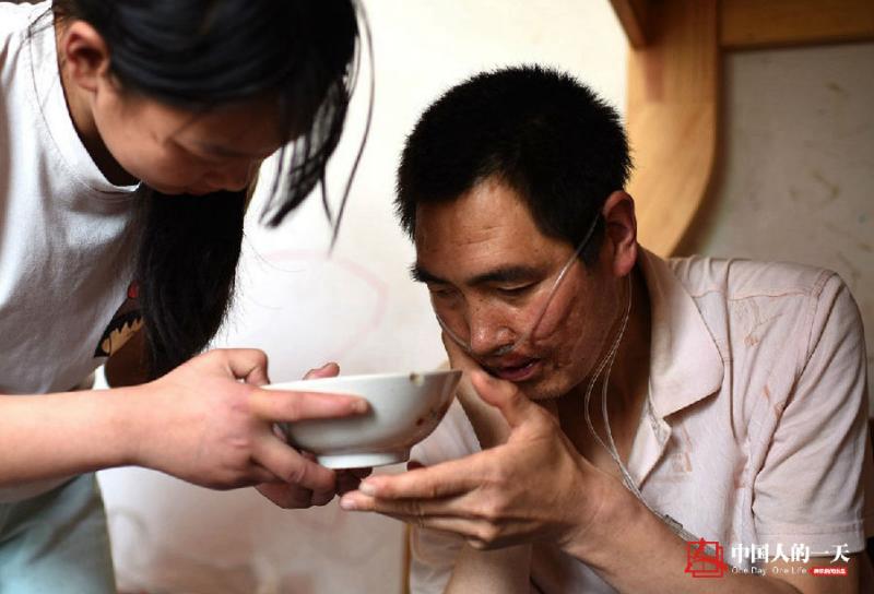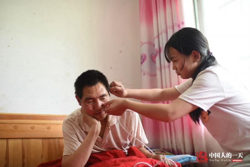 八年过去了,爸爸的病还没好,玲玲长成了大姑娘。玲玲的爸爸江谋银从小也是个苦娃娃,4个月大时,不慎掉入火炉里,脸上烫伤不说,还瞎了右眼;17岁就跟随村里人去金矿打工,每天在井下打钻。前些年,他发现自己干起活来上气不接下气,就去医院检查,大夫诊断为肺部感染,直到2012年被正式确诊为尘肺病。图为玲玲在照顾爸爸。现在,41岁的爸爸很虚弱,只能由家人照顾。16岁的玲玲和妈妈一起扛起了这个重任。