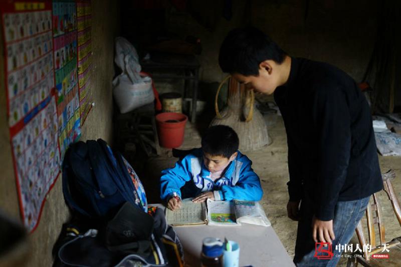在湖北口乡,尘肺病已不仅仅是一种难以治愈的职业病,更是绝大多数村民的“心病”。有媒体报道,2015年湖北口乡政府估算,这个乡疑似尘肺病人已经达到1000人左右。当地的东川中心小学200多名学生,将近一半来自尘肺病家庭,其中大部分是父亲患有尘肺病。图为尘肺孤儿张荣海叮嘱弟弟陈广新做作业。