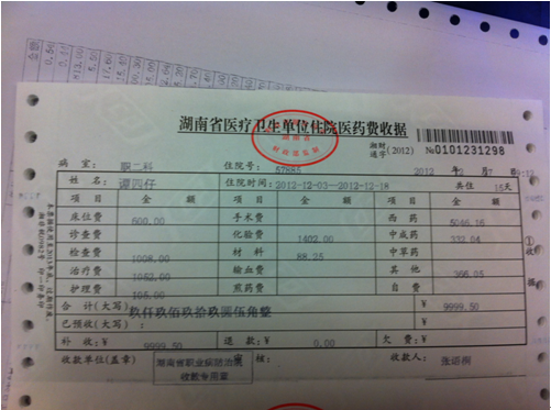 8. 治疗过程:2012年12月3日入住湖南省职业病防治院,住院号:57885,病区:15楼;床号:+22号。经治疗出院时肺部感染得到控制。